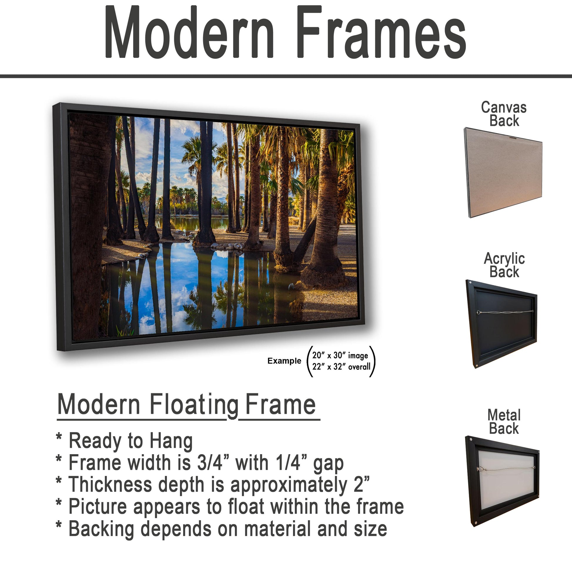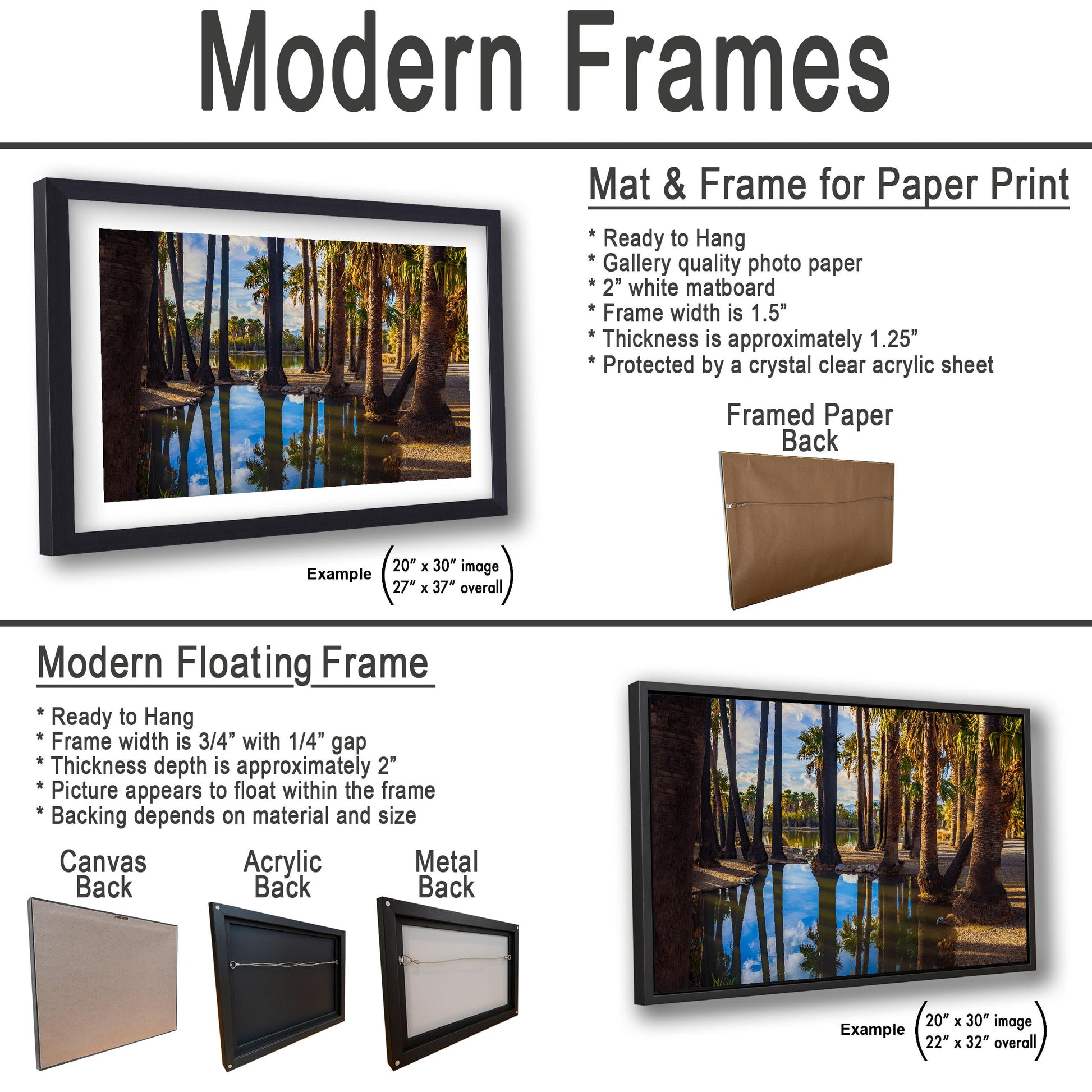 We currently offer modern black frames only for canvas prints. Traditional photo prints, metal, and acrylic options are sold unframed, giving you the freedom to choose a style that best matches your space.