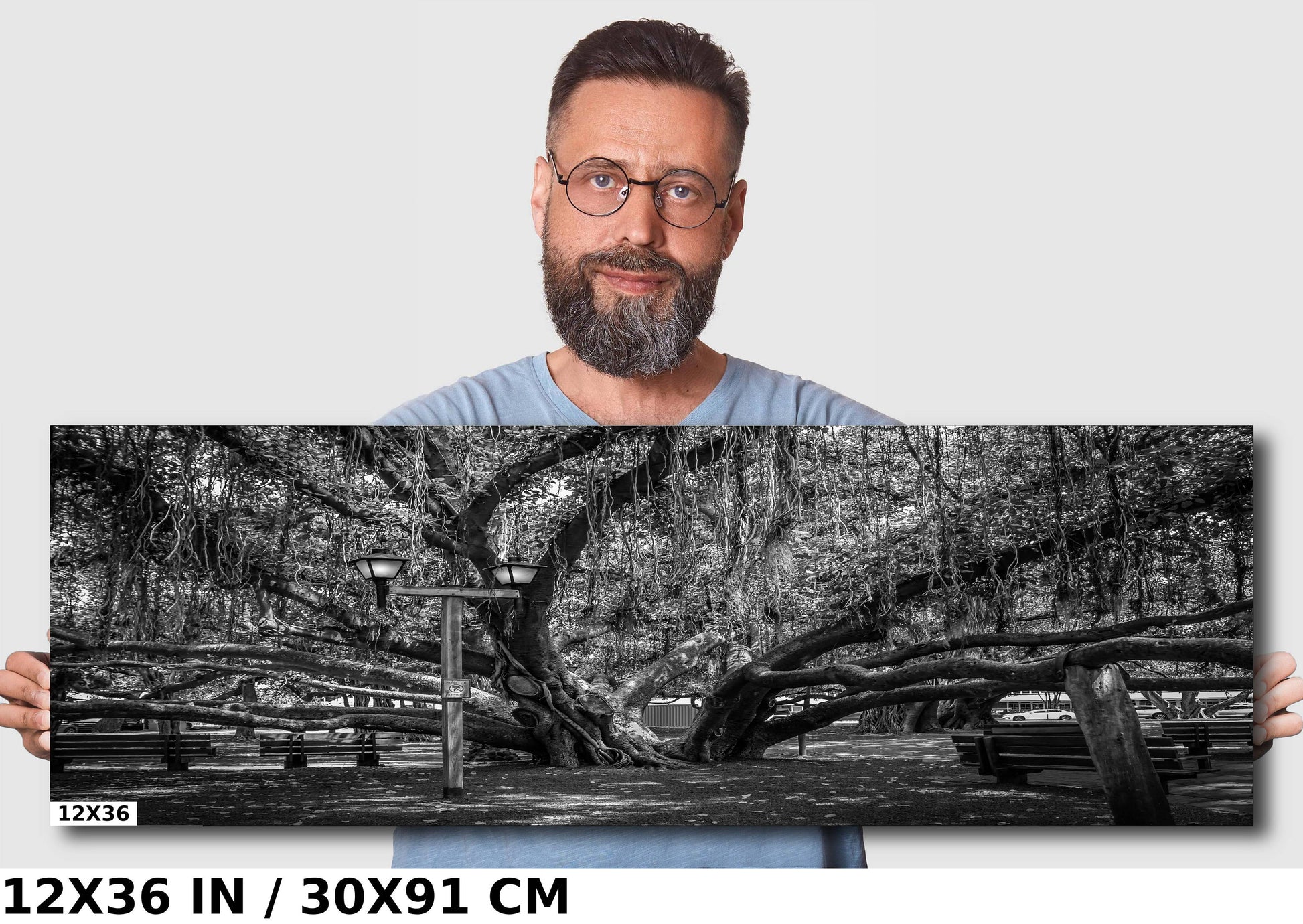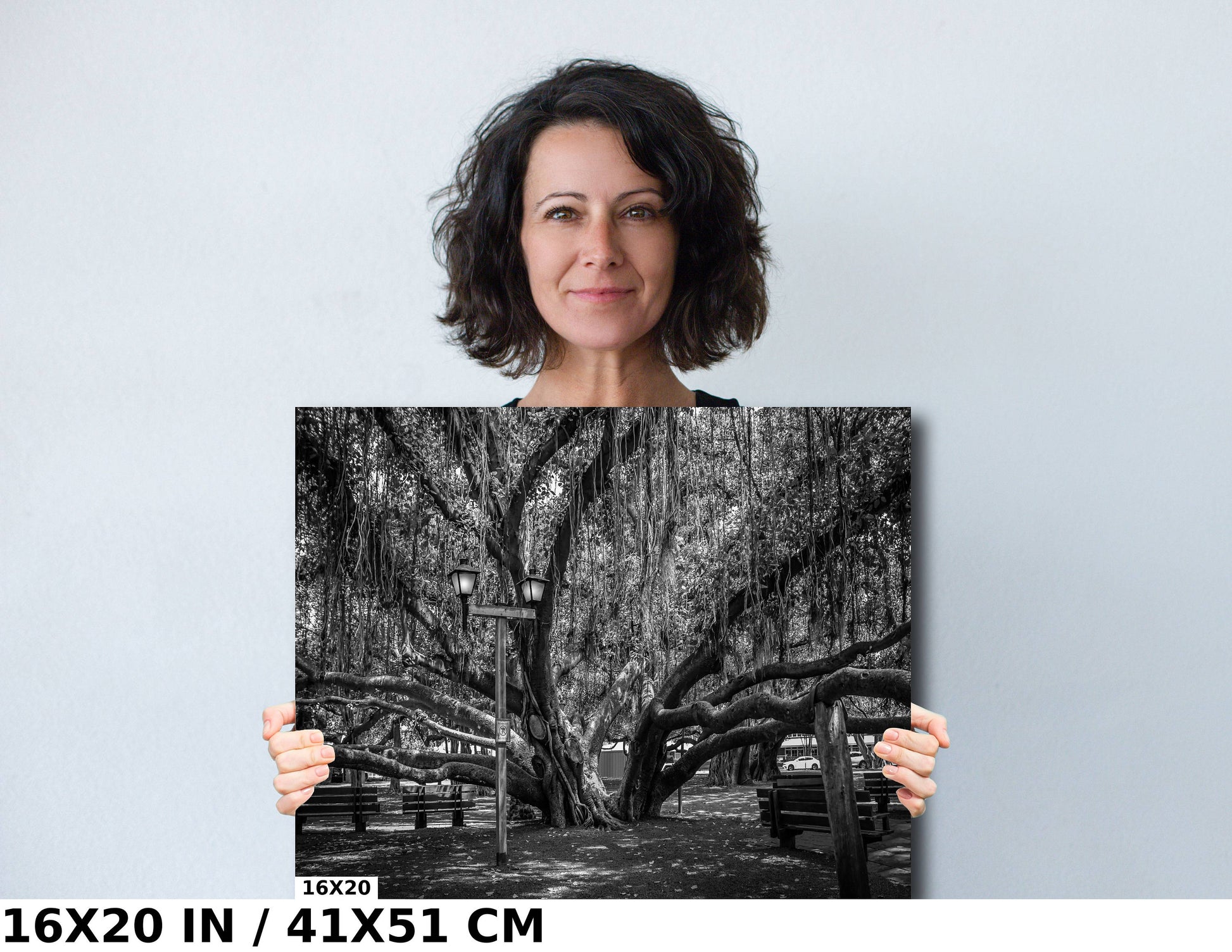 Shade of Serenity: Laihana Hawaii Banyan Tree Black and White Photography Maui Nature Canvas Metal Print Wall Art