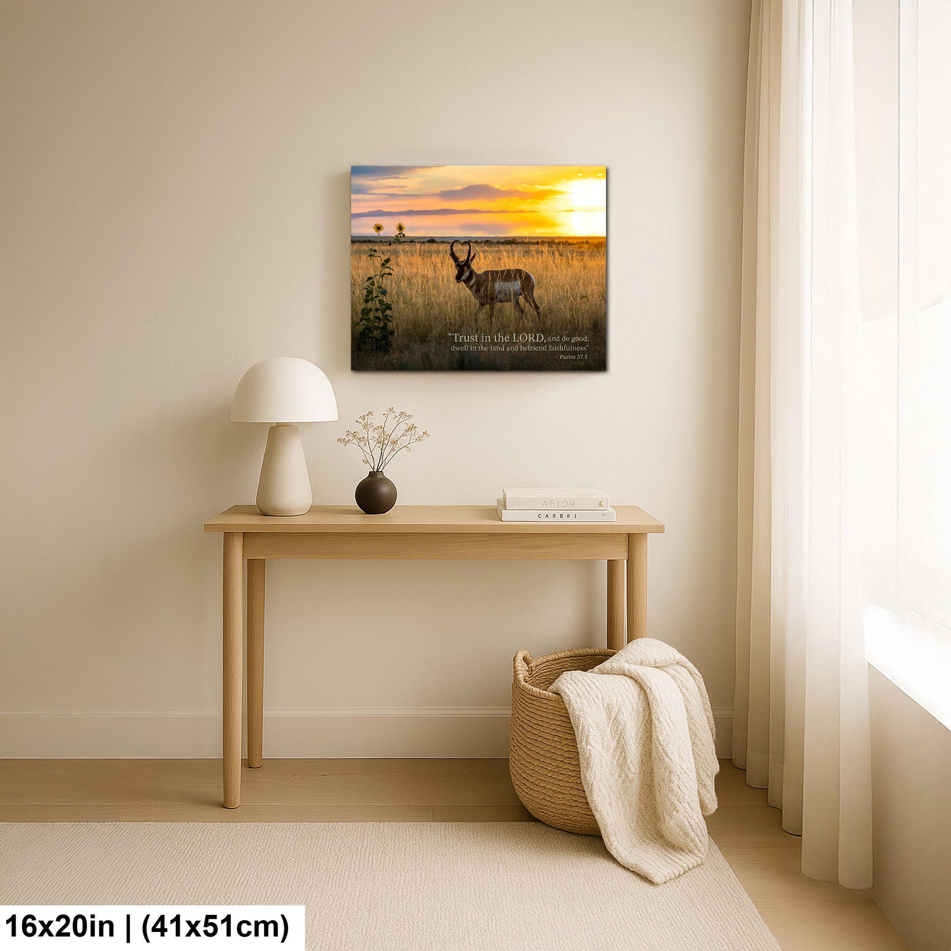 A fine art photography print featuring a pronghorn antelope at sunset on Utah’s Antelope Island, paired with the verse “Trust in the Lord, and do good; dwell in the land and befriend faithfulness.” — Psalm 37:3. The scene glows with warm evening light reflecting across the desert grasslands and the Great Salt Lake horizon. This inspirational artwork combines faith and nature, creating a piece that radiates peace and spiritual encouragement.