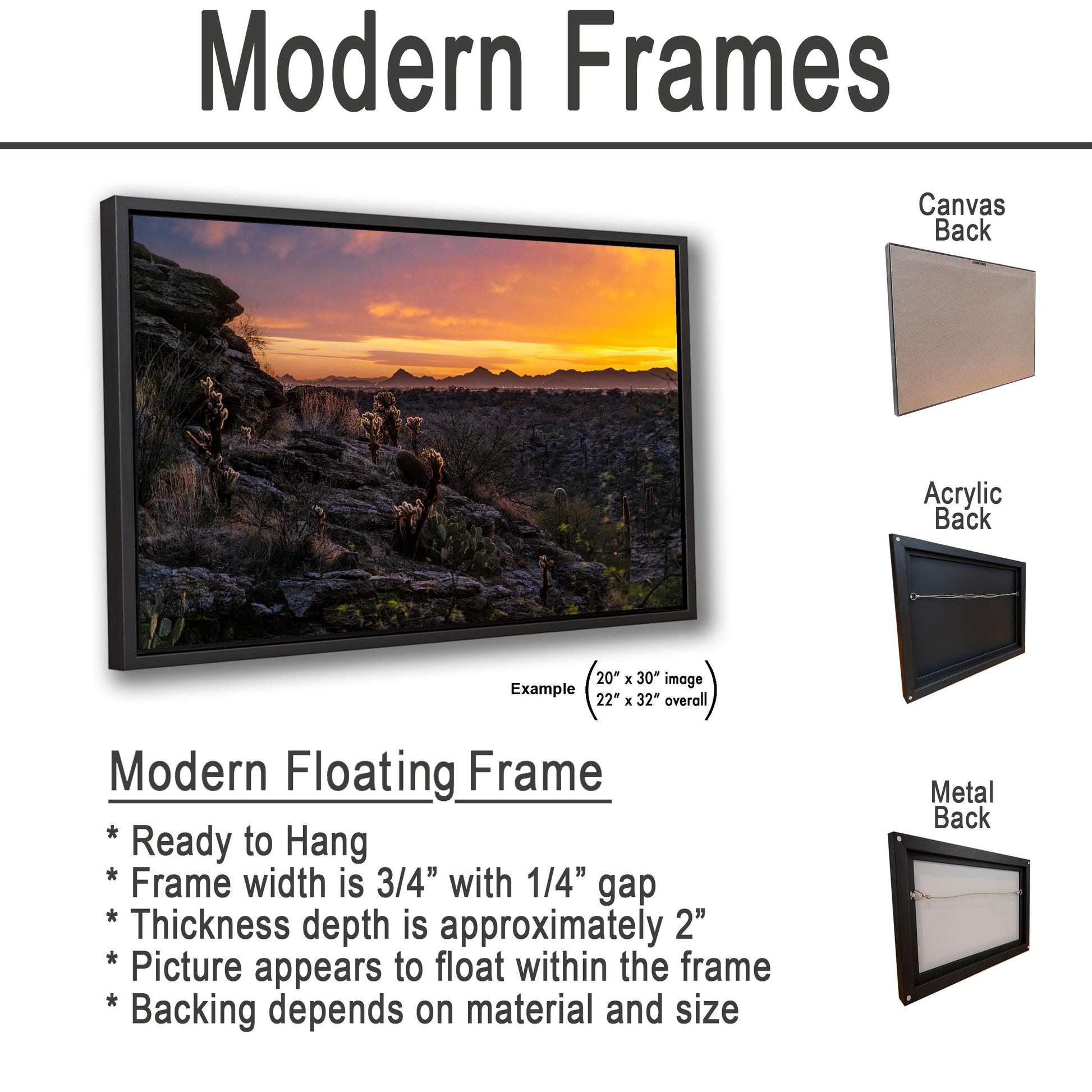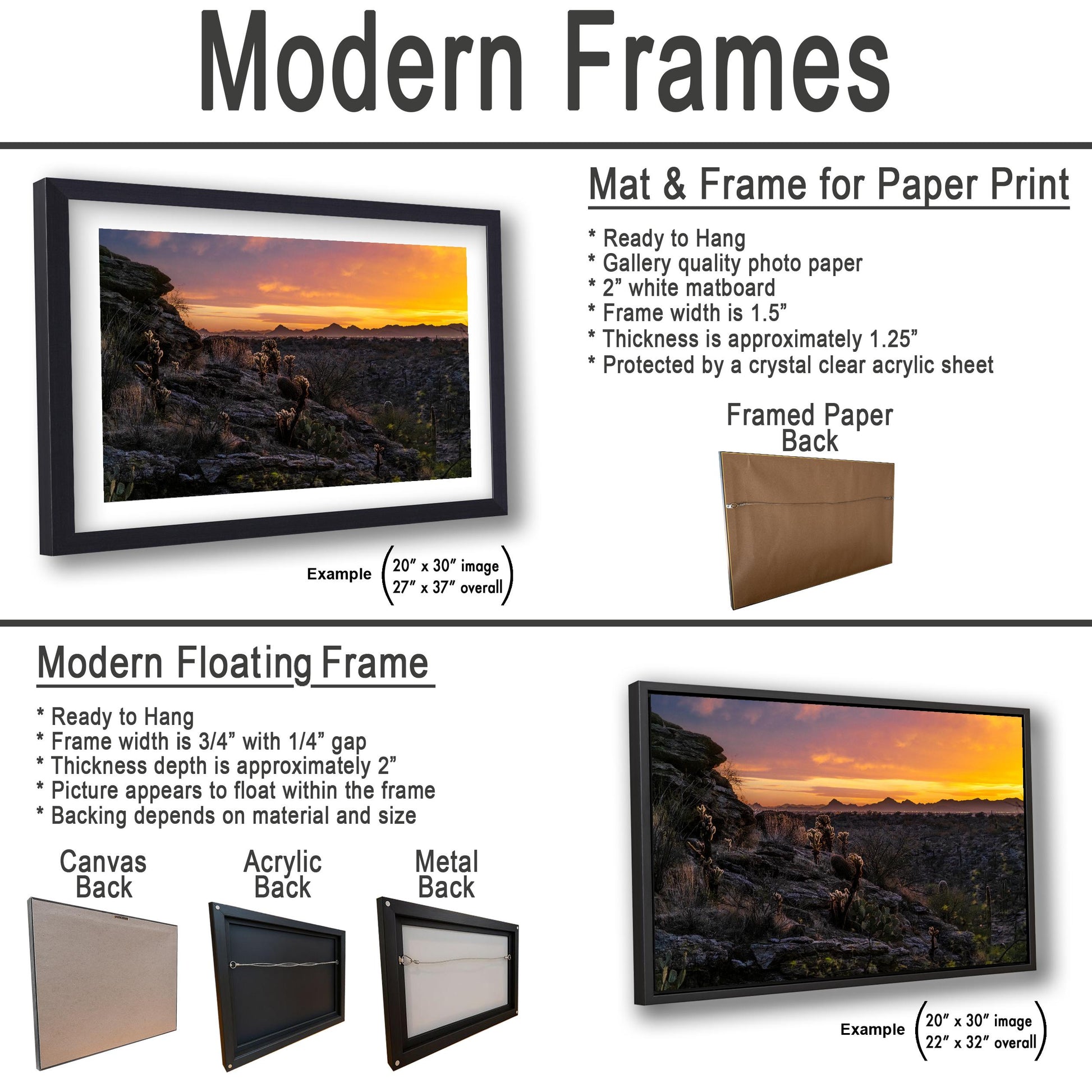 We currently offer modern black frames only for canvas prints. Traditional photo prints, metal, and acrylic options are sold unframed, giving you the freedom to choose a style that best matches your space.